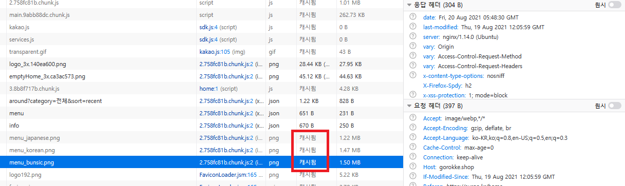캐시된 이미지를 사용하게 되어 네트워크 응답속도가 향상되었다!